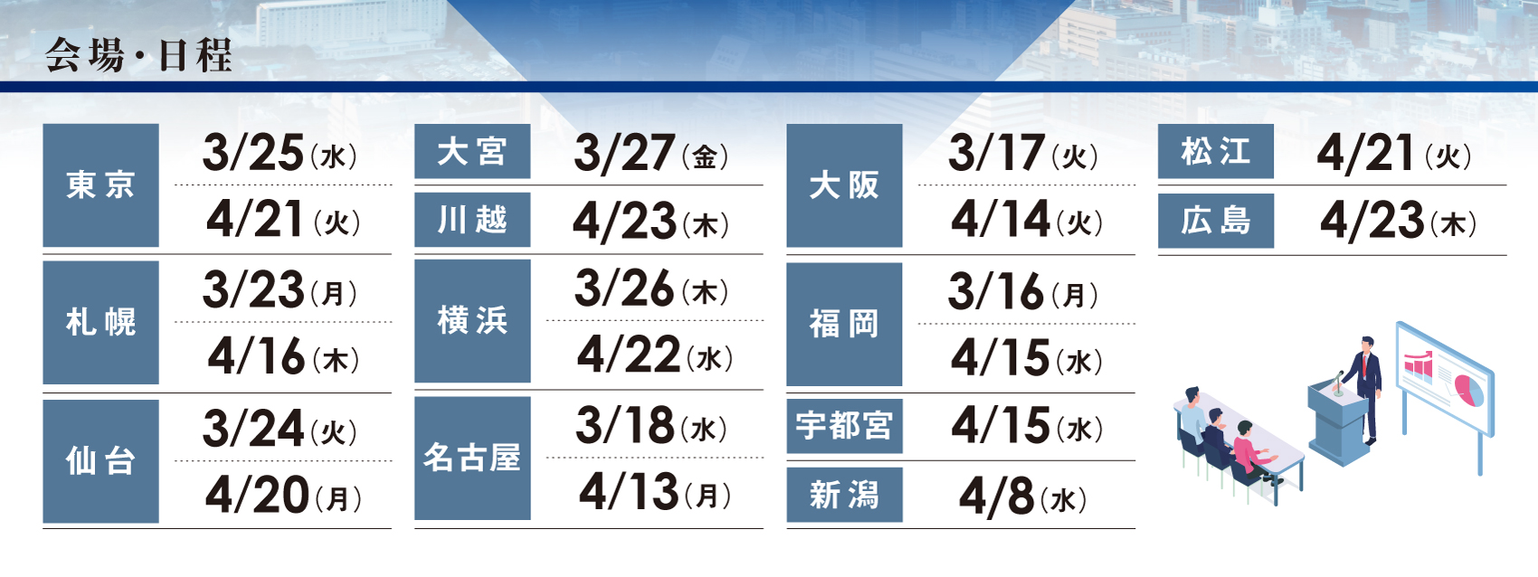 | 開催日時 | 開催地 | 会場 | メイン講師 | 状況 | |